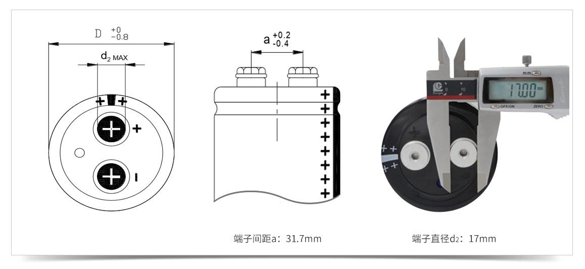 400V5600uF螺栓型電容器端子直徑為17mm,兩個(gè)端子間距為31.7mm,螺紋為:M6。