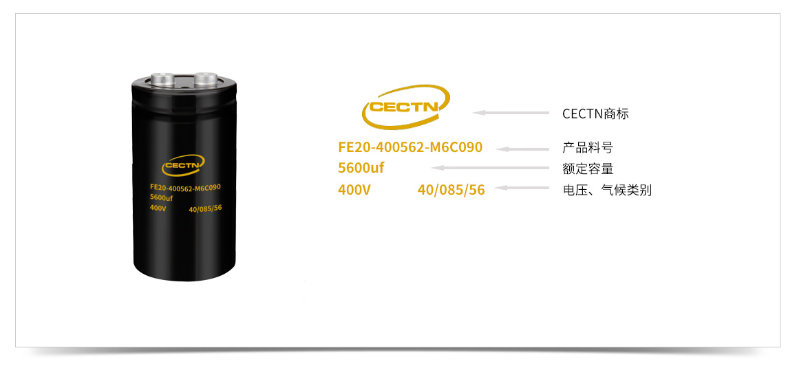 ? ? ? ? 鋁電解電容的料號(hào)又兩個(gè)部分組成,上面是CECTN商標(biāo),下面為電解電容型號(hào),包含訂購(gòu)代碼、電壓、容量、溫度、壽命、安裝方式等信息。詳細(xì)了解請(qǐng)點(diǎn)擊進(jìn)入《凱琦佳鋁電解電容料號(hào)說(shuō)明》頁(yè)面。
