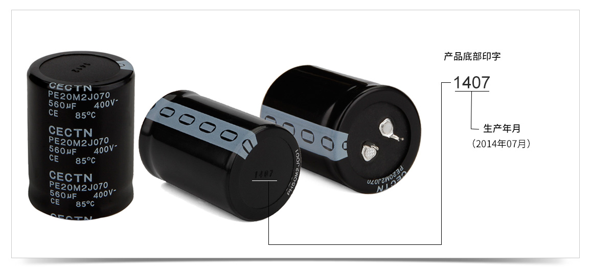 牛角型電解電容底部印字信息為4位數(shù)組成,代表著該產(chǎn)品的生產(chǎn)年月,上圖所示的1412即表示該產(chǎn)品為2014年12月所生產(chǎn)。