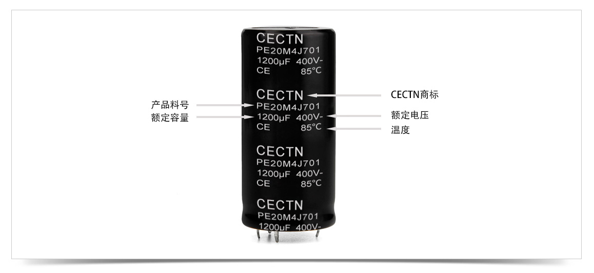 CECTN電解電容印字信息中包含了牛角型電解電容的電壓、容量、溫度、壽命、焊針數(shù)量型號(hào)等眾多信息,詳細(xì)了解請(qǐng)點(diǎn)擊進(jìn)入《牛角型電解電容料號(hào)說明》頁面。